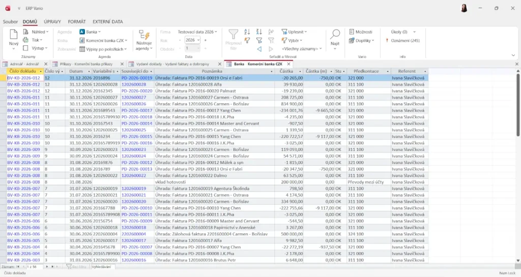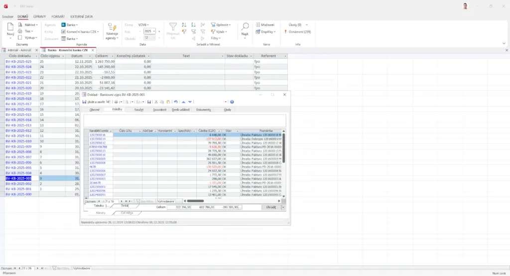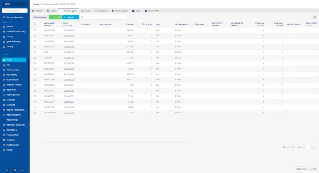 Systém automaticky hledá odpovídající doklady podle variabilního symbolu, částky a dalších údajů. Díky tomu minimalizuje chybovost a zpřehledňuje finanční evidenci. Uživatelé tak mají vždy aktuální stav úhrad i salda.