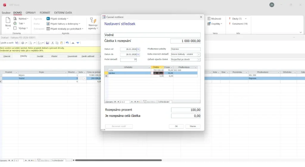 Rozúčtování vychází z pravidel, která si uživatel nastaví v rámci doplňku. Vario následně automaticky vytvoří doklady přesně podle daného schématu, takže odpadá riziko chybných ručních výpočtů.