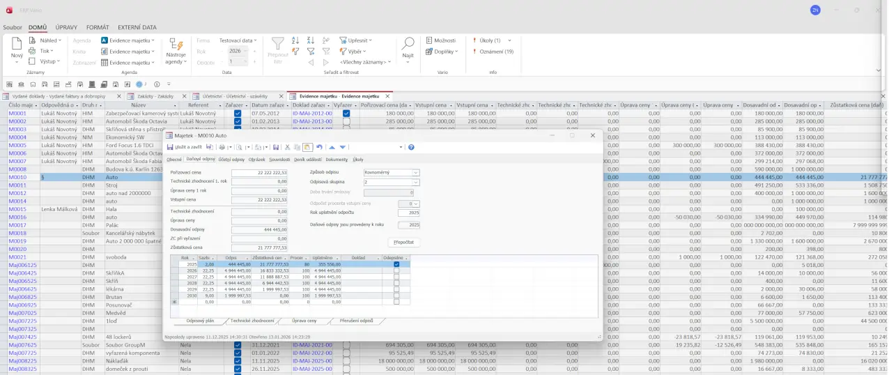 Systém automaticky počítá daňové i účetní odpisy. Umožní vést skutečné hodnoty majetku bez zdlouhavých manuálních úprav.