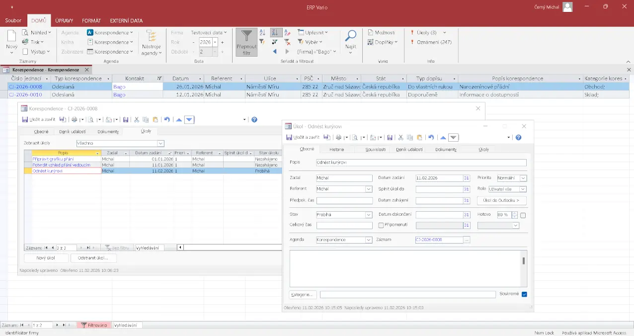 Korespondence není izolovaná – přirozeně se váže na kontakty, dokumenty a úkoly v ERP systému Vario.