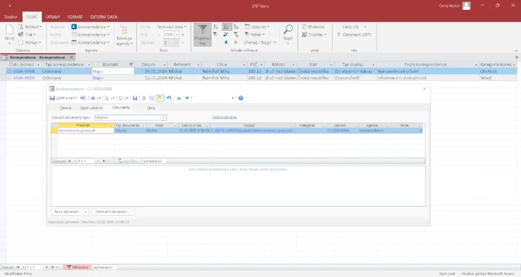 Ano, ke každému záznamu lze připojit související dokumenty. Ty jsou dostupné přímo z prostředí ERP systému Vario.