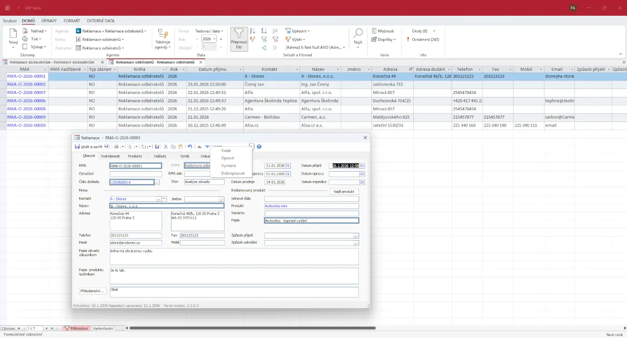Reklamace jsou vždy propojené s původními doklady a daty v ERP systému Vario. Nevznikají duplicity a je zřejmé, z jakého plnění nebo obchodu reklamace vychází.