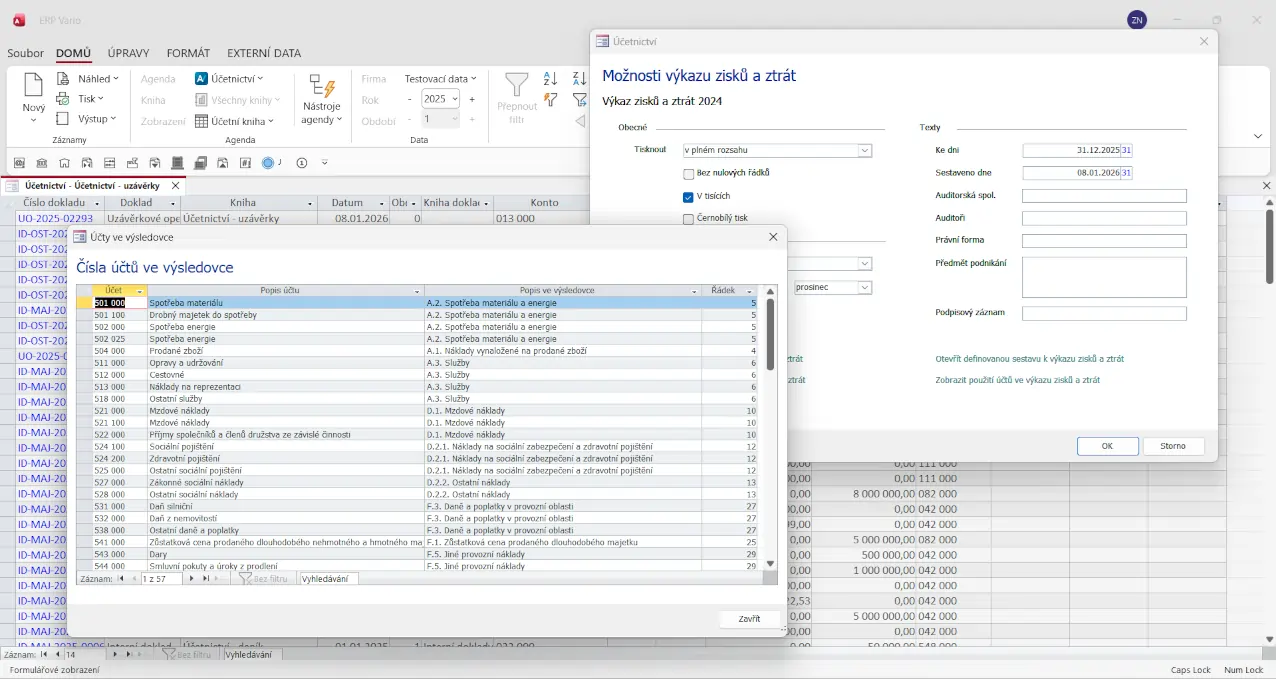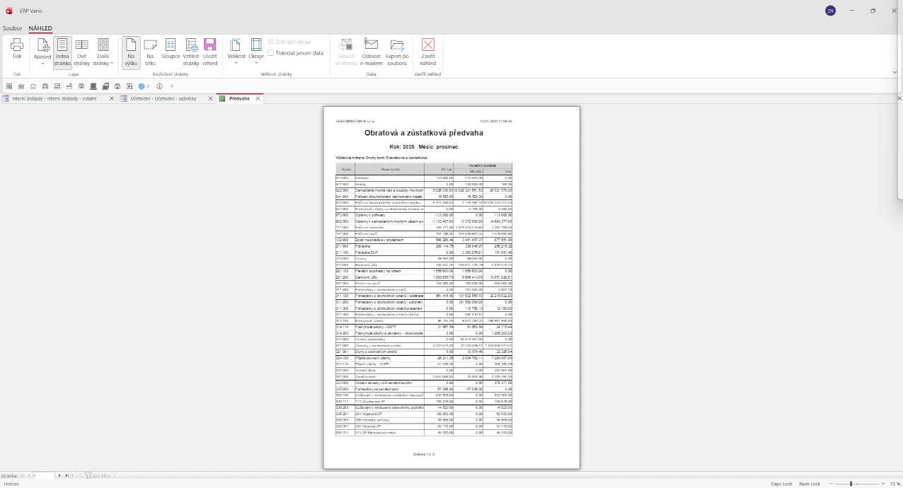 K dispozici jsou standardní účetní sestavy i přehledy, které lze filtrovat podle analytiky, středisek nebo zakázek. Výstupy lze exportovat a předávat auditorům nebo poradcům bez další úpravy.