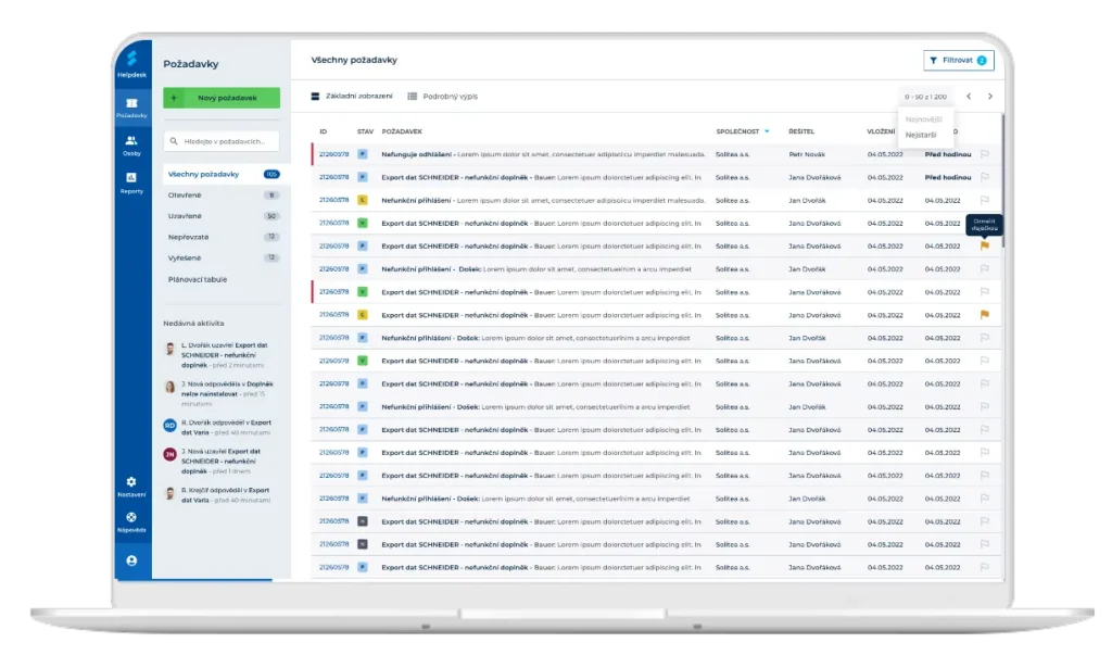 - Sledování dat o výkonu techniků, stavu zakázek a zákaznické podpory.